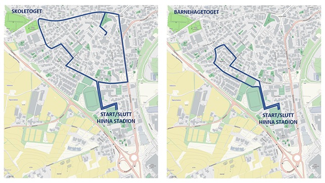 Toget går forbi Hinna skole og ut på Sara Bergesgate. Videre rute sees på kart med beskrivelse for hovedtoget og for barnehagetoget som har kortere rute. Hinna Brass stopper ved Frue Gamlehjem og spiller mens skolene går ned Kari Lofthusgate til Vågedalen Sykehjem sammen med Jåtten skolekorps og Jåtten juniorkorps. Hinna Brass venter i krysset ved Kari Lofthusgate til skolene kommer tilbake fra Vågedalen Sykehjem. Barnetoget fortsetter ut Grannesveien og svinger ned mot Boganesveien. Toget går videre i retning sør på Fv44 til Sara Bergesgate der det svinger inn igjen mot Hinna Stadion hvor toget oppløses i samme område som det startet. Flaggborgen og Jåtten skolekorps fortsetter sammen med Jåtten skole helt inn på skolegården før de avslutter.
