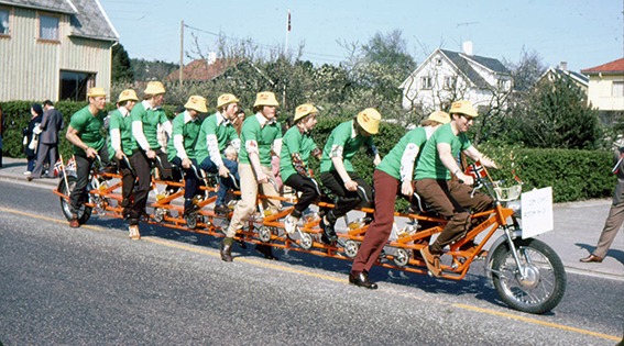 HINNA: I begynnelsen av 1975 ble det kjent at sykkelfabrikken på Sandnes, Jonas Øglænd hadde laget en sykkel der 7 personer kunne sykle sammen. På den tiden jobbet jeg i Sandnes. På vei hjem en dag hjem kjørte jeg forbi Øglænd og da sto sykkelen ute. Tanken min blei straks: Denne skulle vi hatt i 17.mai-toget på Hinna.