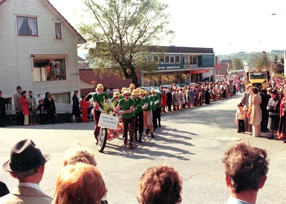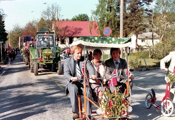 For 3. år på rad fikk vi lånt utstyr hos Øglænd. Denne gang en 3-hjuling med plass til 3 personer, samt en sparkesykkel, som ikke var så vanlig i den tiden. Vi som deltok hadde det moro, og tiltakene blei godt mottatt i 17. mai toget.