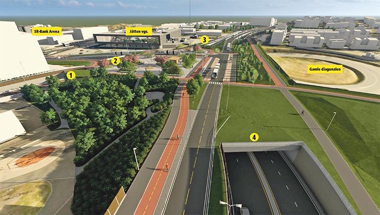 Alle som benytter seg av veiene Boganesveien, Jåttåvågveien og Diagonalen skal fremover kjøre gjennom den nye, permanente rundkjøringen under bakken. Det vil bli ett kjørefelt i hver retning inn og ut av kulvertene - med utvidelse til to kjørefelt inn og ut av rundkjøringen. Når trafikken nå legges inn i kulverten, kan entreprenøren begynne med ferdigstilling av sideområdene og området over selve rundkjøringen.